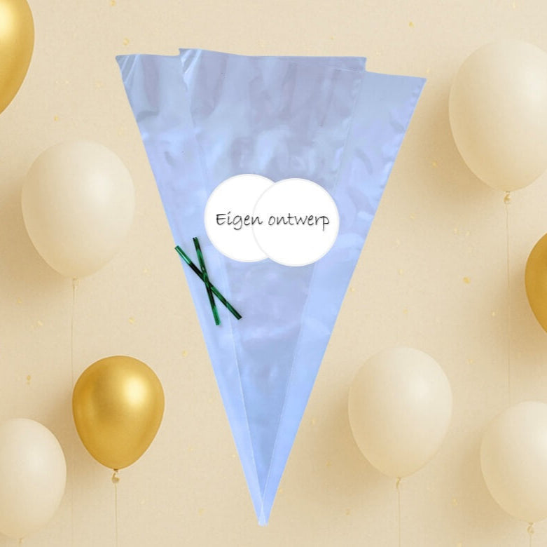 Lege puntzak, om zelf te vullen met bijvoorbeeld chips, spekjes of popcorn. Upload je eigen foto of afbeelding en noteer de tekst voor op jouw sticker (optioneel).